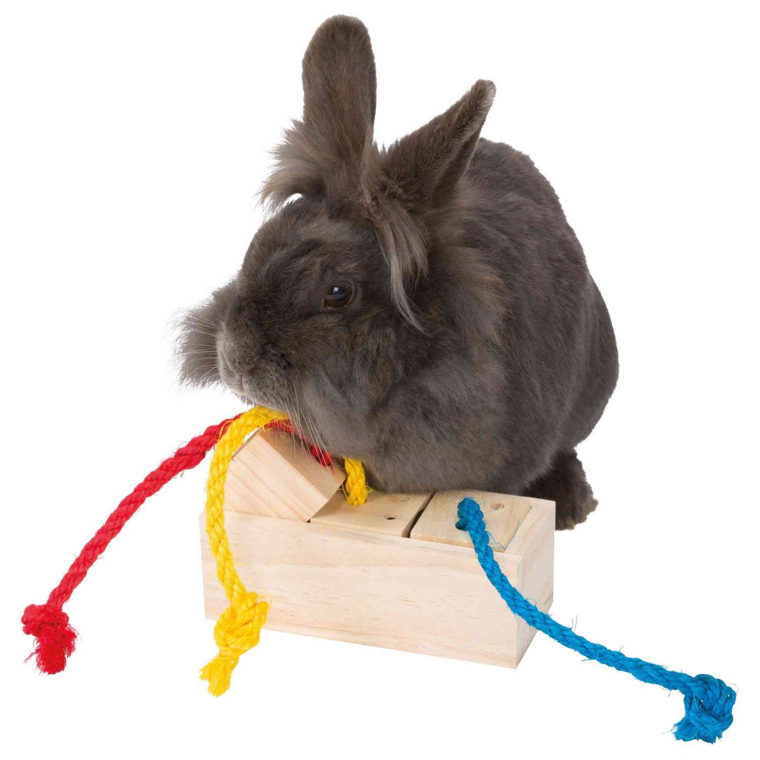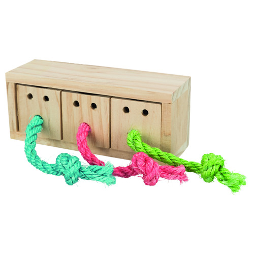 De kubus bevat sisaltouwtjes waar je dier aan moet trekken, dan komt de beloning tevoorschijn. De grote luchtgaten ondersteunen de zoektocht naar het voedsel. Je kan de kubus op 2 manieren neerzetten zodat je 2 moeilijkheidsgraden hebt. Het product is gemaakt van onbehandeld hout en is dus volledig veilig voor je dier.