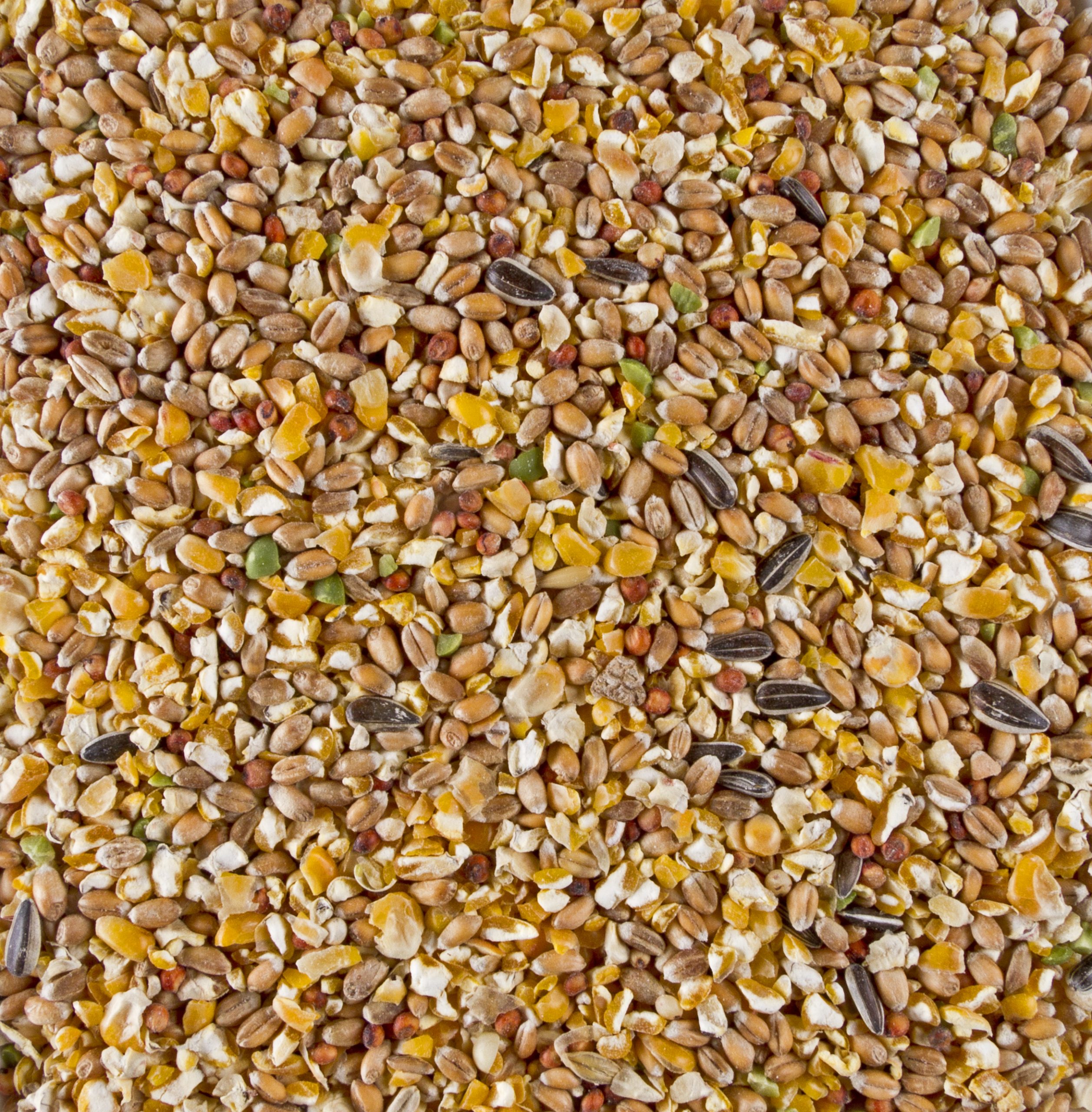 - Het bevat gebroken maïs en een assortiment energie- en eiwitrijke granen en zaden zoals tarwe, milo, en gebroken groene erwten, zonnepitten en cardi.
