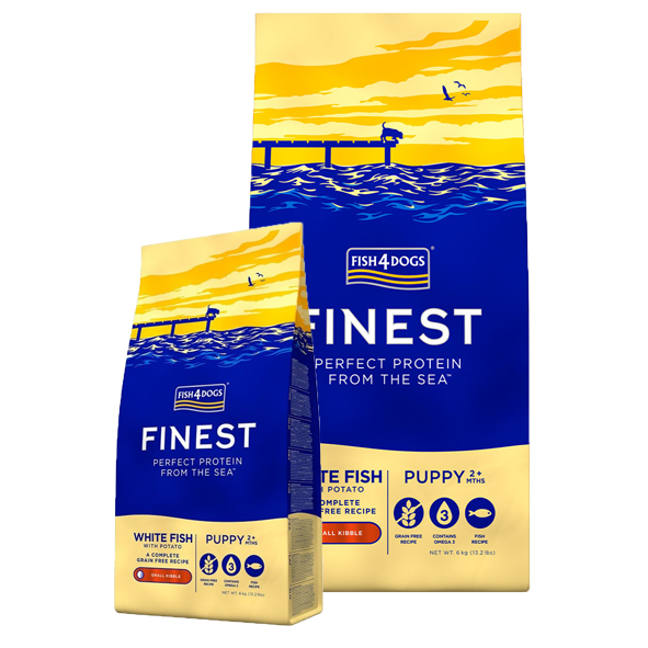 Fish4Dogs Finest Puppy bevat nog meer vis, waarmee het een zeer proteïnerijke complete voeding is, ideaal voor opgroeiende puppy’s.