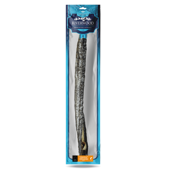 Ambachtelijk gedroogde zalmhuid met vlees. De Riverwood zalmhuid met vlees is een natuurlijke snack welke voor 100% uit zalm bestaat. Dit maakt deze snack in het bijzonder geschikt voor honden met een voedselallergie. De Riverwood zalmhuid met vlees is een échte beloning voor jouw trouwe viervoeter.