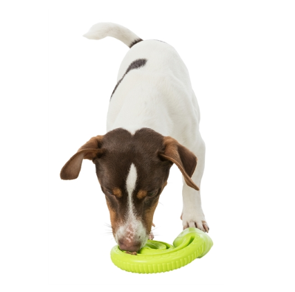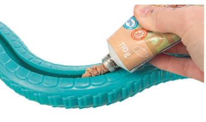 Deze vrolijke snack-slang is gemaakt van thermoplastisch rubber en is open aan de onderzijde. In deze spleetvormige opening kun je verschillende soorten voer of snacks stoppen, zodat de hond spelenderwijs bezig is zijn beloning te krijgen. Door de smalle opening is de slang ook geschikt voor bijvoorbeeld leverworst: de hond is lang bezig alle paté uit de opening te likken.