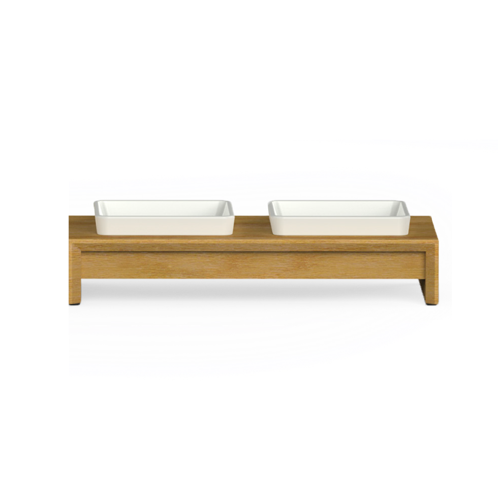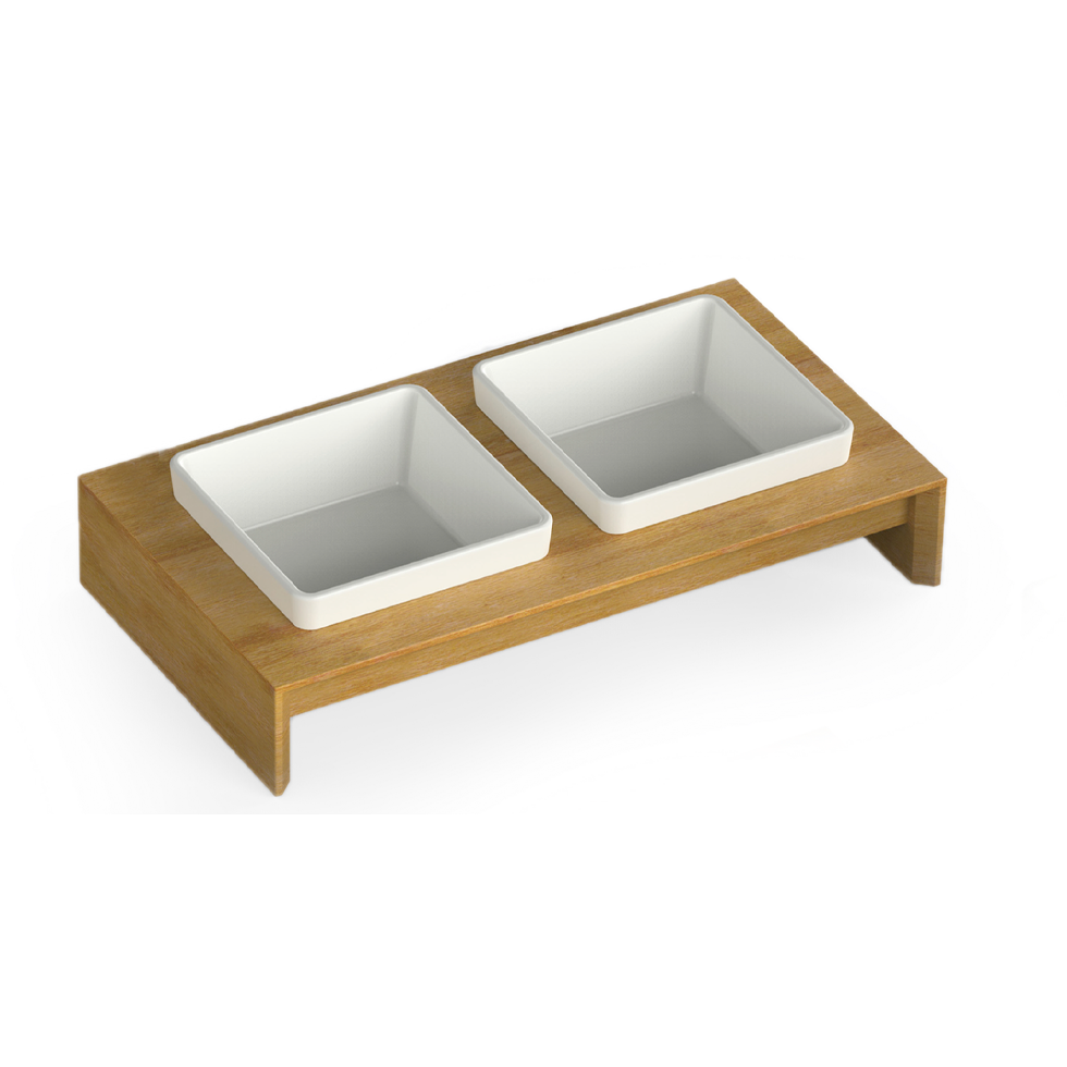 Complete set, bestaande uit een houten standaard en 2 keramische voer-/drinkbakjes. Er zitten kleine nopjes onder de houder, om deze goed op zijn plaats te houden.