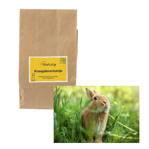 Mengsel van biologische grassen, bloemen en kruidenzaden om de knaagdieren continu van vers groenvoer te voorzien.