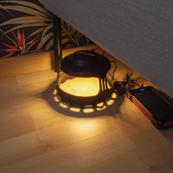 Het apparaat is uitgerust met 2 kleuren verlichting (warm en blauw licht) om insecten via licht of warmte in de val te lokken. De verlichting is naast kleur ook in lichtsterkte (2 standen) aan te passen om een grotere aantrekking te realiseren en het bereik te verdubbelen van 46 naar 92 m2.