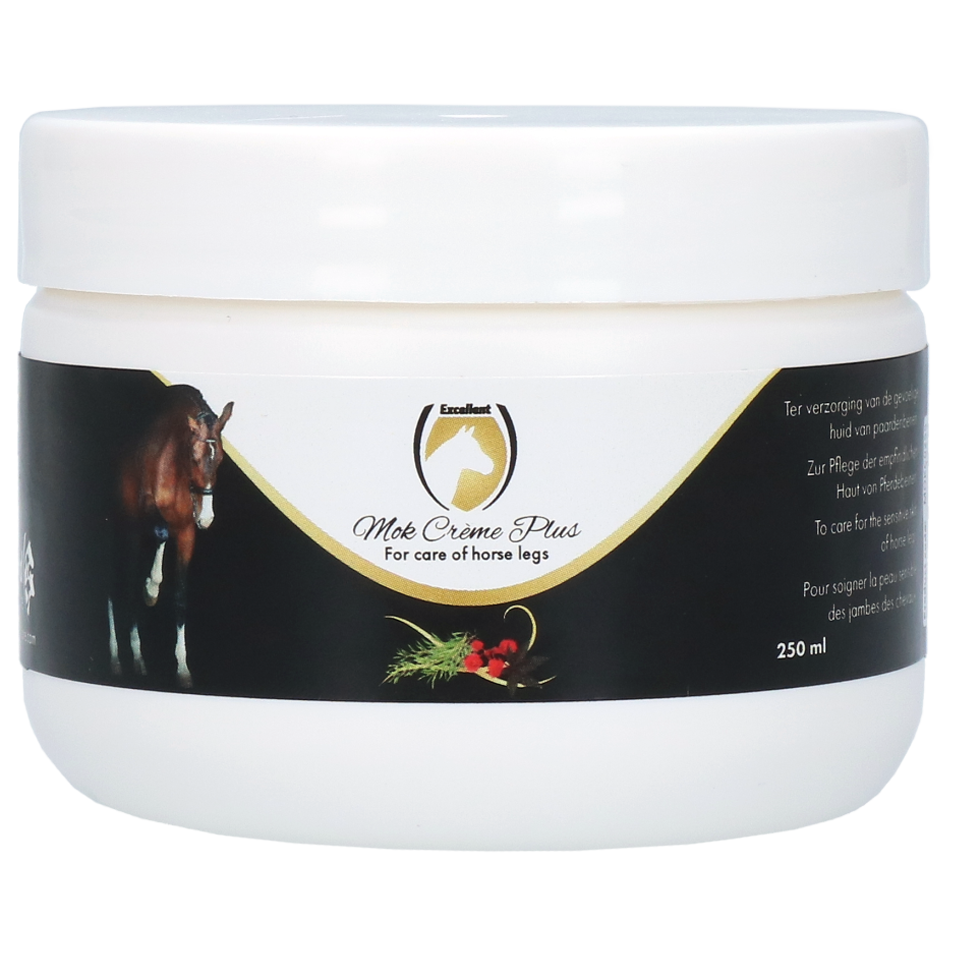De Mok Creme Plus 250 ml van Excellent is een huidcreme voor paarden, ter verzorging van de gevoelige, rode en geprikkelde huid van de benen