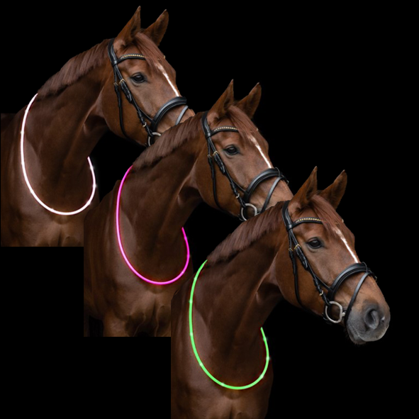 De lichtgevende halsband van Waldhausen zorgt ervoor dat u ook in het donker en met mist veilig over straat kunt met uw paard of pony.