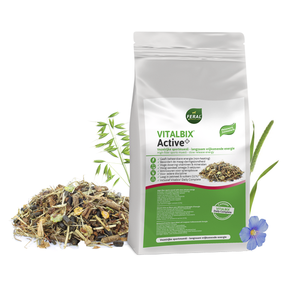 Vitalbix Active+ is een complete sportmuesli die je paard de benodigde energie geeft. Je kunt Vitalbix Active+ voeren als enkele aanvulling op het ruwvoer of combineren met Vitalbix Daily Complete balancer. Vitalbix Active+ bevat 24% Daily Complete brokjes. Voer je 1 kg Vitalbix Active+ minder dan het voedingsadvies vul dan aan met (1.000 gram x 24% =) 240 gram Vitalbix Daily Complete voor de benodigde vitaminen & mineralen. Met deze combi kun je de hoeveelheid energie gemakkelijk afstemmen op de energiebehoefte van jouw paard. Train je een periode wat minder? Dan verlaag je de hoeveelheid Vitalbix Active+ en verhoog je de hoeveelheid Vitalbix Daily Complete.